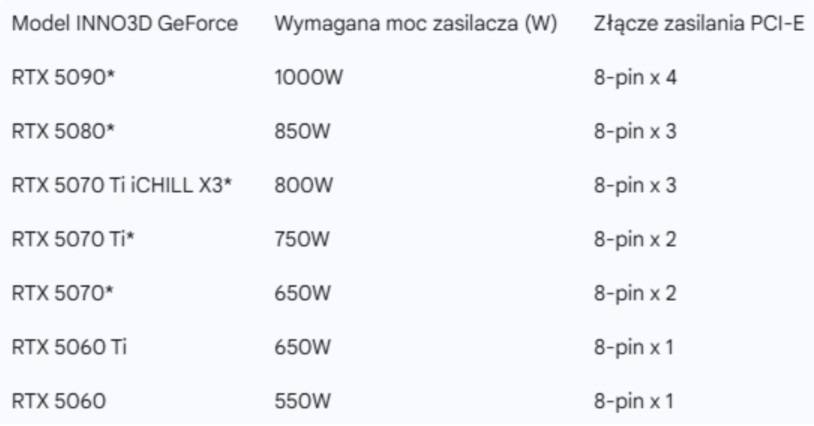 Poniżej przedstawiono zalecane wymagania dotyczące zasilania dla poszczególnych modeli Inno3D GeForce RTX serii 50: