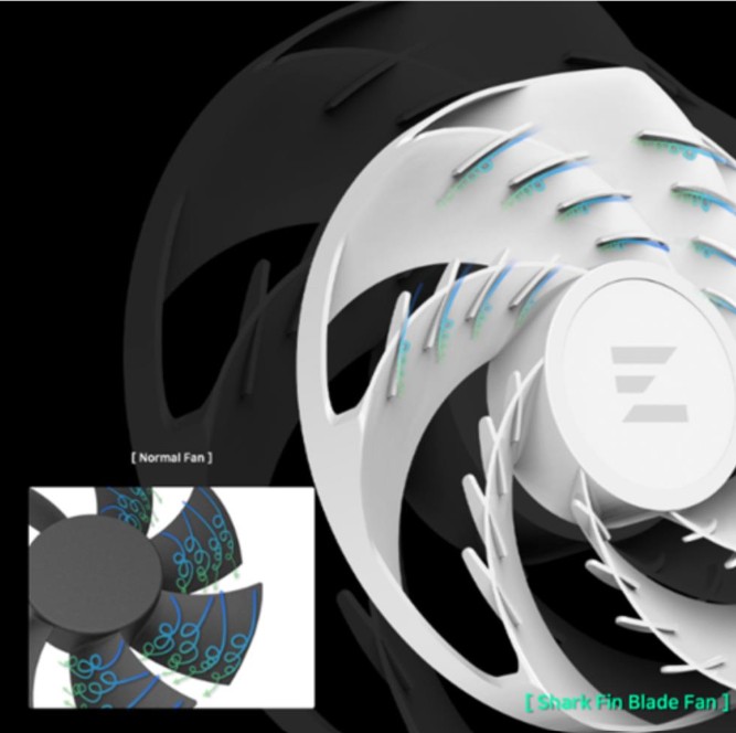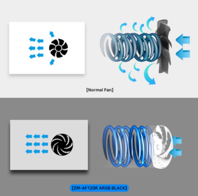 Model ZM-AF120R charakteryzuje się unikalną konstrukcją łopatek przypominających płetwy rekina. Taki kształt ma zapewniać spójny, zintegrowany wygląd bez widocznej tylnej części wentylatora i jednocześnie umożliwić odwrócenie kierunku przepływu strumienia. Dzięki temu można liczyć na maksymalizację efektywnego przepływu poprzez redukcję strat na zewnętrznym obwodzie wirnika.