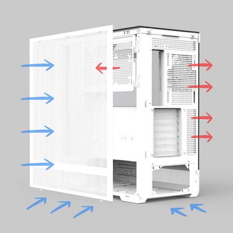 Jak wiadomo większość obudów posiada jakąś formę wywietrznika na górze (miejsce montażu wentylatorów lub chłodnicy), co ułatwia ucieczkę ciepłego powietrza z wnętrza PC. W przypadku P40 Prism taka metoda wentylacji odpada ze względu na obecność jednolitego kawałka hartowanego szkła. Zamiast tego praktycznie każdy inny metalowy panel w obudowie pełni funkcję meshu: dół, oba boki, tył. Pod obudową mamy duży filtr przeciw kurzowy, pokrywający całą perforowaną podłogę. Następnie niewielki wywietrznik umieszczono pod szklanym panelem obok portów I/O a po przeciwnej stronie cała metalowa pokrywa pełni rolę wywietrznika.